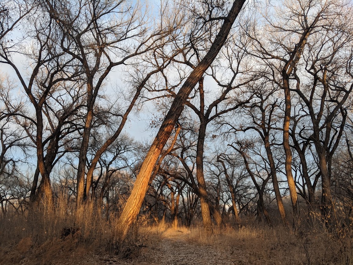 As you walk through the bosque trail be on the lookout for animal tracks and scat. You can usually hear multiple birds singing and if you look carefully you can see dozens of birds in the trees. You may also come across deer and elk in the brush.