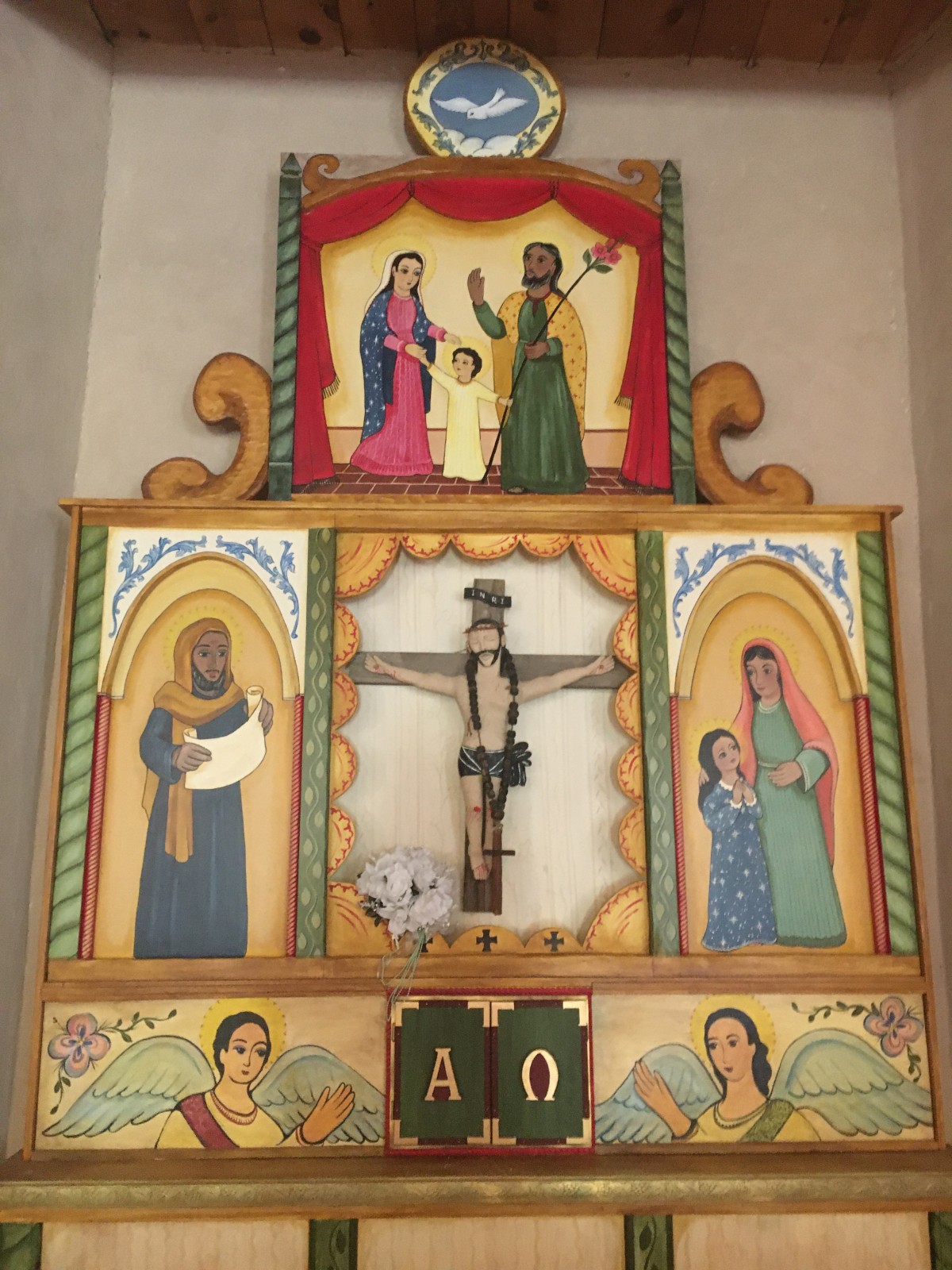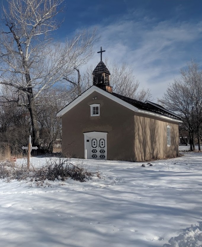 This private chapel was built in its current form in 1886 after a particularly terrible flood. The chapel was dedicated to the Holy Family by the Ortiz family, which is seen in the theme of the Alter inside the church. In 1891 the chapel was deeded to the Archdiocese of Santa Fe who still owns it and about 2 acres of the land it sits on.