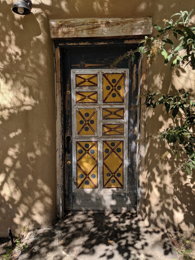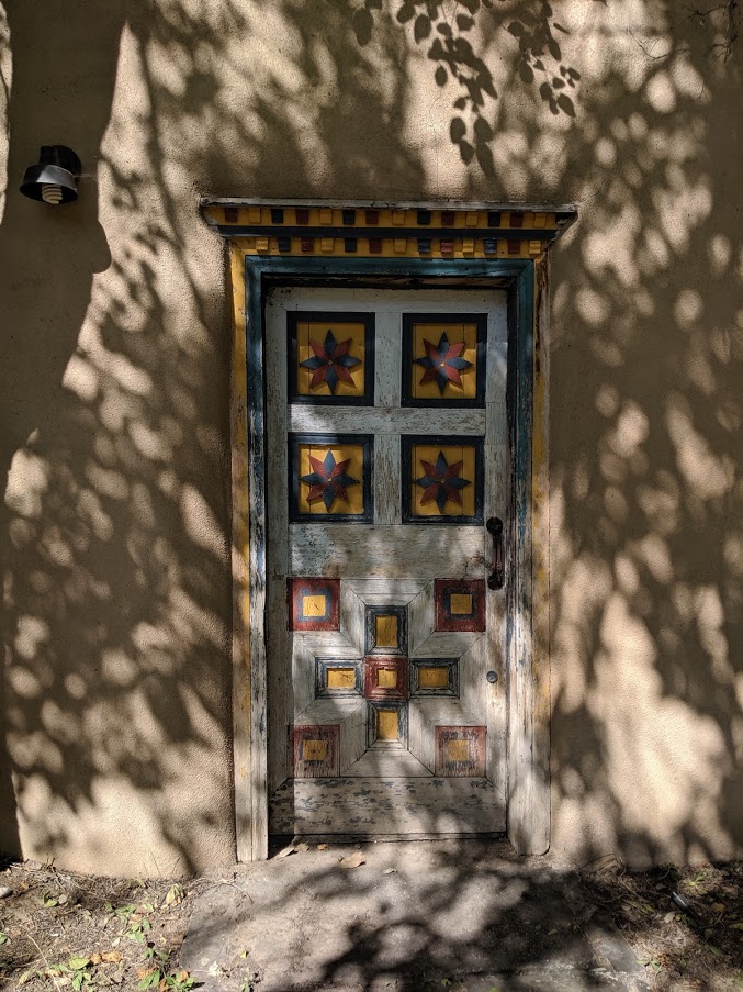 These doors into the storehouse are located on the eastern side of the building. The door with the stars on it is much older and dates to the period when the storehouse was originally built. The less symmetric door dates to the 1940s and was commissioned by Mary Cabot Wheelwright as a decorative addition to the storehouse.